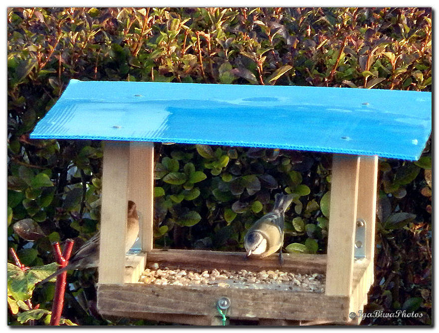 Les petits oiseaux commencent à venir au jardin pour se ravitailler en graines ! Des moineaux, des merles et quelques mésanges volent autour du petit abri que mon mari a fabriqué pour eux !