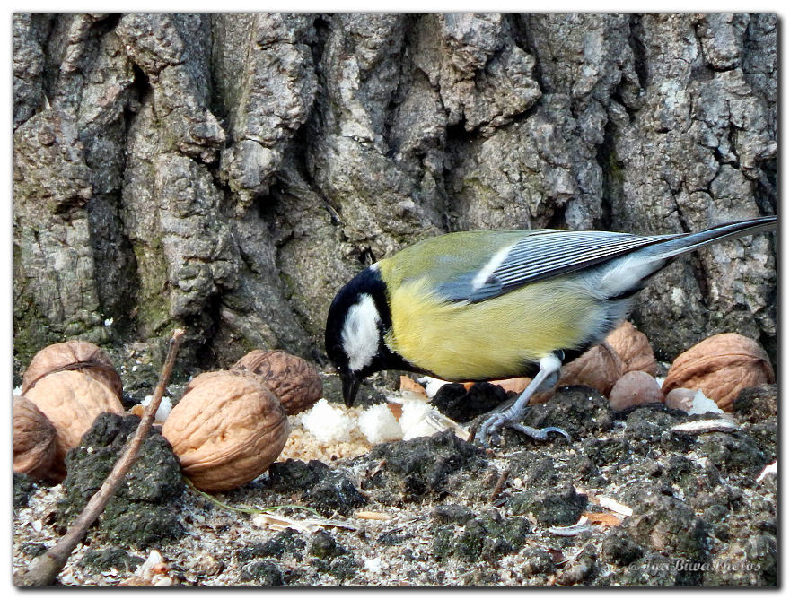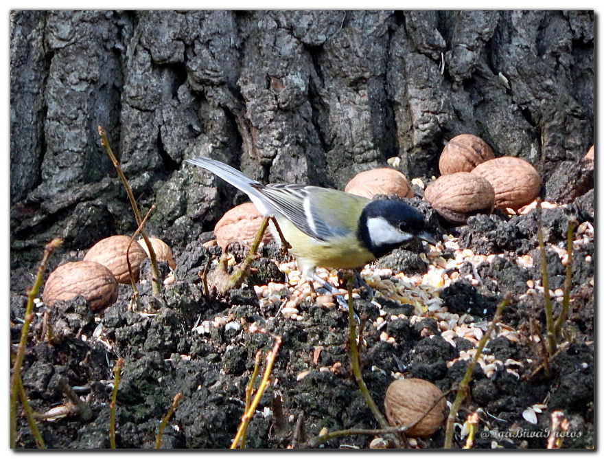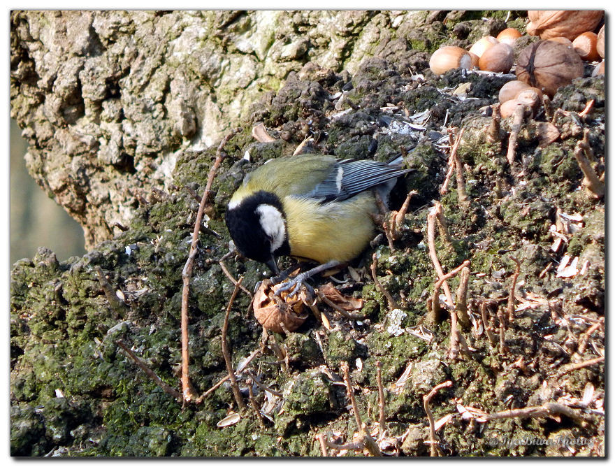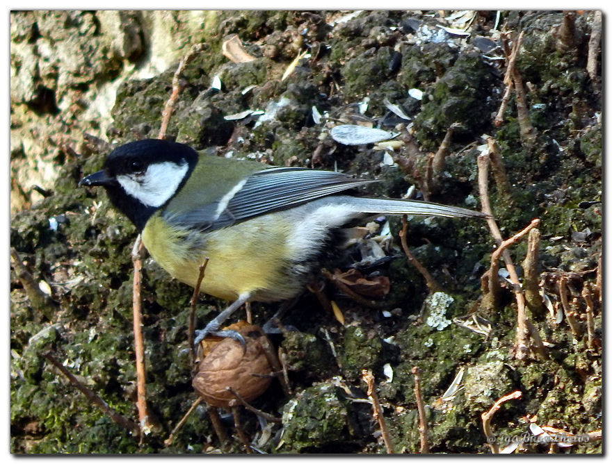 Cette petite mésange charbonnière s'est approprié une noix ouverte par un écureuil !